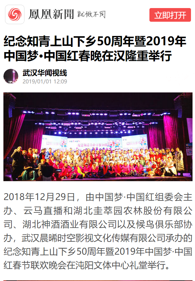 2018年(nián)12月(yuè)29日(rì),由中國(guó)夢&miφ&♣✘ddot;中國(guó)紅(hóng)組委±₹會(huì)主辦、雲馬直播和(hé)湖(hú)北(běi)圭萃園★βφ↓農(nóng)林(lín)股份有(yǒu)限公司、±↔♠•大冶市友聯酒業有限責任公司以及候鳥俱樂(yuè)部協辦,武漢晨晞時(shí)₩ε→空(kōng)影(yǐng)視(shì)文(wén)化(huà)傳☆γ媒有(yǒu)限公司承辦的(de)紀念知(zhī)青上(shàng) δ≤山(shān)下(xià)鄉(xiāng)50周年(nián)暨201™±∑"9年(nián)中國(guó)夢·中國(guó)紅(hón<∏↔g)春節聯歡晚會(huì)在沌陽文(wén)體(tǐ)中心禮堂舉←₩÷行(xíng)。